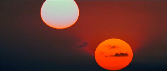 6、两把光剑打败西斯 蕾伊用两把光剑抵御了西斯的闪电攻击,将闪电反射击中了皇帝帕尔帕廷,最后一个西斯死亡,帕尔帕廷被自己的力量击中并产生爆炸。蕾伊最后将卢克的光剑和莱娅的光剑拆解后组合在一起,两把光剑组成一把新的、黄色的光剑。这也是“星战”第一次出现黄色光剑。 7、经典一吻 蕾伊耗尽原力击杀帕尔帕廷后死去,此时凯洛·伦奇迹般地从深渊中爬出来,看到蕾伊,他想起了蕾伊治愈自己的能力,凯洛·伦决定牺牲自己,将自己的生命和力量传送到蕾伊体内,蕾伊苏醒过来的时候,他们有了深情一吻,凯洛·伦随即“形神俱灭”,最后一个天行者死亡。 8、两个太阳 影片最后以两个太阳交映的画面结束,呼应1977年《星球大战:新希望》中卢克眺望红日的场景。