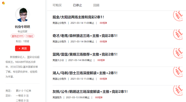 北京时间3月15日星期日,本个NBA比赛日过后,专家转身牛哄哄3场全红,豪取一波5连红!小炮穆桂英继续出色发挥,今日两场全部打出,预测篮彩已斩获10连红![超值优惠!充值最高赠送1188] [名人专家] 专家转身牛哄哄今日3场全红,命中篮网小分+奇才赢盘+步行者赢盘,另外在独行侠vs掘金的预测中,精准判断出掘金在背靠背的赛程中很难有好状态,并且指出了外线无法限制东契奇,命中独行侠赢盘,展现了极强的专业素养!期待他今日的篮球方案![查看方案]
